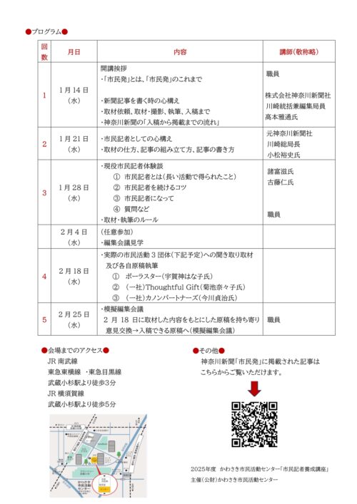 受講後は、かわさき市民活動センターのボランティア市民記者として登録・活動できます。あなたが取材・執筆した記事が、川崎市内の市民活動を紹介する神奈川新聞「市民発 地域をつくる人・活動」欄に掲載されるチャンスです。(第2・4木曜日掲載)