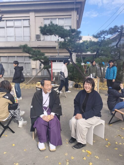 そこでメンバーの松本恭子さん(41)=写真右=は本とコーヒーを媒介に、新旧の住民が交流できる場を実現した。共催する金子善光宮司(79)=同左=は「昔のように境内に人が集まる風景がうれしい。新世代の声が集まれば、神社も地域も盛り上がる」と期待しエールを送る。